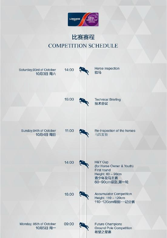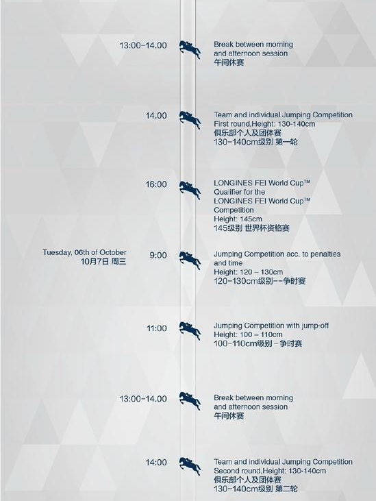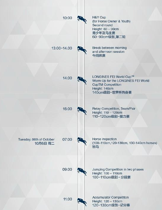 2015浪琴表国际马联(FEI)场地障碍世界杯-中国联赛总决赛即将迎来收官之战,今年的中国联赛总决赛将于10月4日—10月7日继续在朝阳公园马术场地举办,届时将吸引众多国内外顶尖马术选手参赛。本站比赛不仅汇聚了国内外优秀骑手,另外还会在赛场周边引入种类繁多的各色主题活动,亮点看点数不胜数,赛程如下,让我们共同期待。