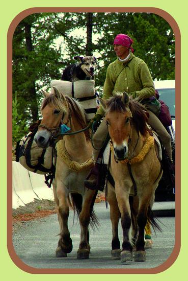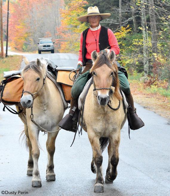 目前她所骑的两匹马分别是Montana Spirit和Essie Pearl,Spirit是挪威峡湾马和佩尔什马杂交的的5岁母马,Pearl是一匹12岁的峡湾母马。在骑行期间,一匹马用来骑行,而另一匹则负载行李。她也会一天停下来三次,完全卸下马的装备好让它们好好休息。驮箱平衡地放置在马背上,其重量不会超过100磅。除了她装着写博客的电脑的小箱子提前托运了,其他物品英德均随身携带。她的行李几乎囊括了生活的全部细节:防水步、帐篷、炊具箱、蜡烛、睡袋、马具、换洗衣物、尖刀、照明灯和枪。