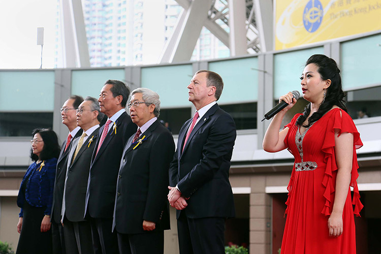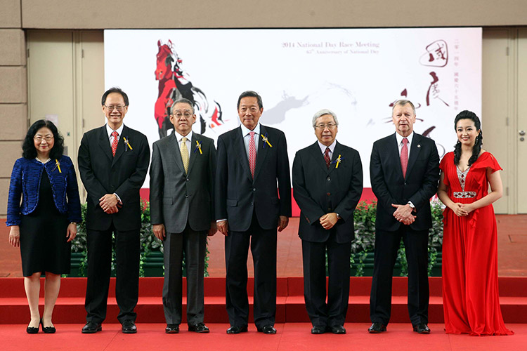 国庆赛马日开幕礼在沙田马场马匹亮相圈举行,香港赛马会主席叶锡安博士(中)、行政总裁应家柏(右二)及董事一同出席开幕礼。