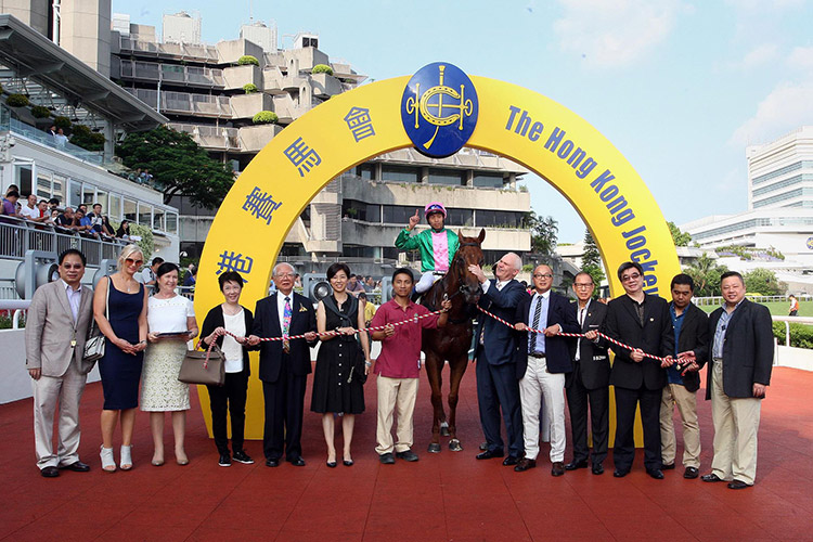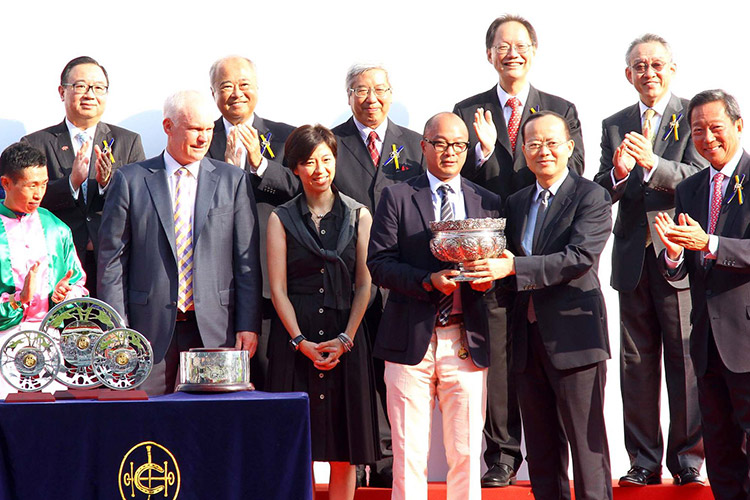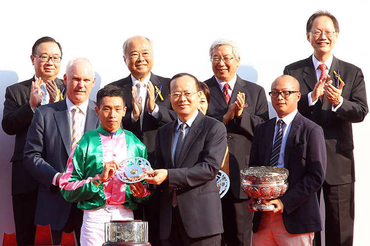 何泽尧策骑「喜宝驹」胜出国庆杯,马主卢楚锵先生及夫人及其亲友在凯旋门拉头马祝捷。