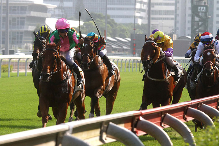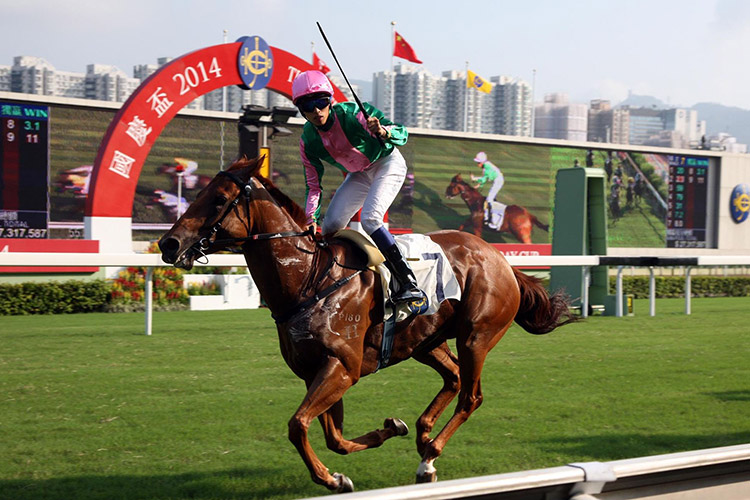 「喜宝驹」( 7号)在何泽尧胯下勇夺香港三级赛国庆杯(1000米)。