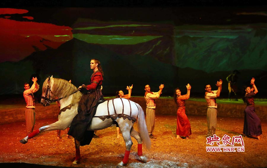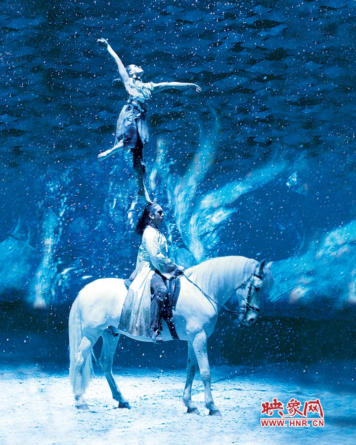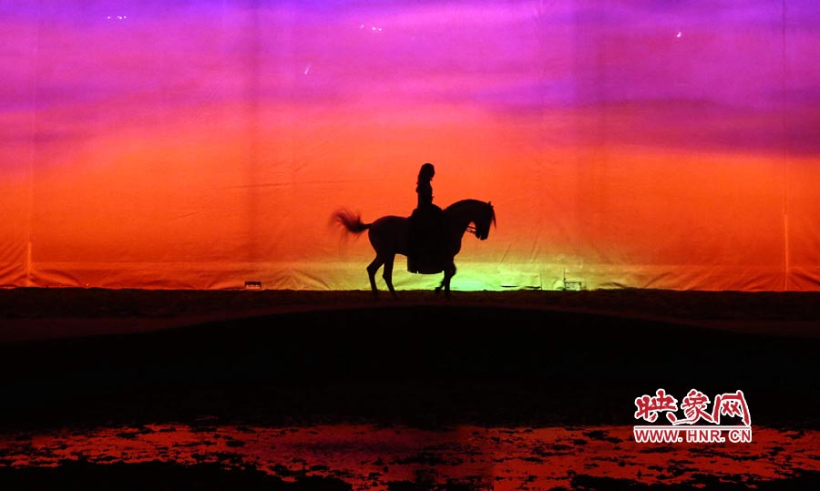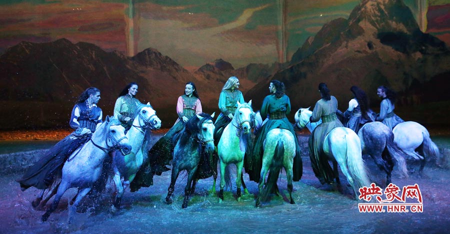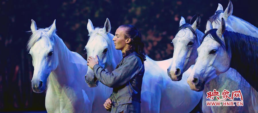 演出一开始,6匹通体雪白的阿拉伯马,在铿锵有力的音乐节奏中,从舞台左侧奔腾而来。