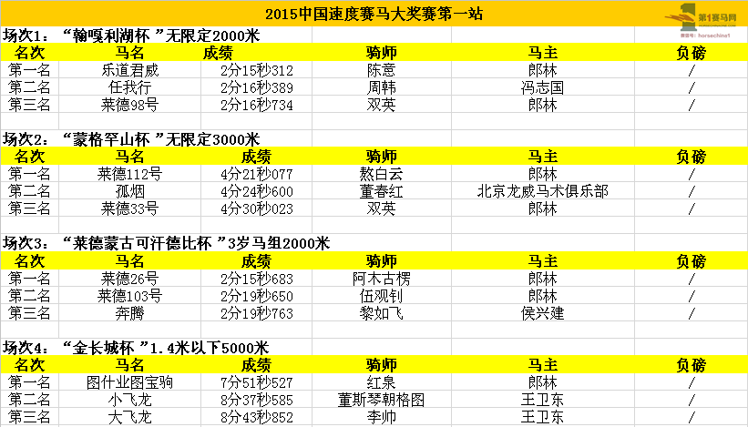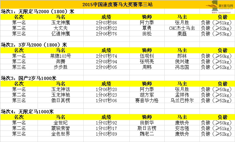 自2008年举办首届比赛以来,中国速度赛马大奖赛已举办至第八届。该赛是由中国马术协会主办的国家级、高规格的年度常规速度马赛事,可谓是往年“中国速度赛马巡回赛”的升级版。2015年中国速度赛马大奖赛已经走过三站:7月11日,第一站在内蒙古科右中旗蒙古族传统体育传承示范训练基地开幕;8月8日,第二站在内蒙古锡林浩特举行;9月5日第三站的“玉龙杯”赛事在山西右玉县玉龙马园激情扬鞭。11月6日至8日,作为年度收官之战的总决赛将在成都举行。