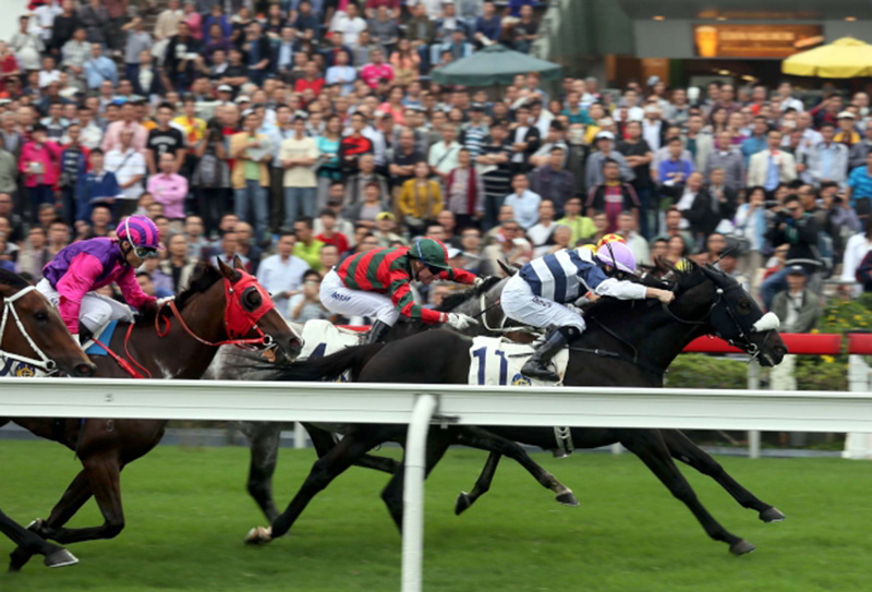 上届莎莎妇女银袋(让赛)由杜满莱策骑的 “包装斗士”(11号)胜出该场1800米香港三级赛