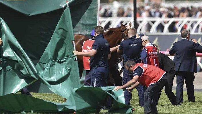在赛事途中,骑师急停,工作人员马上用布幕围起“红色礼物”,检查伤势后转送兽医治疗。