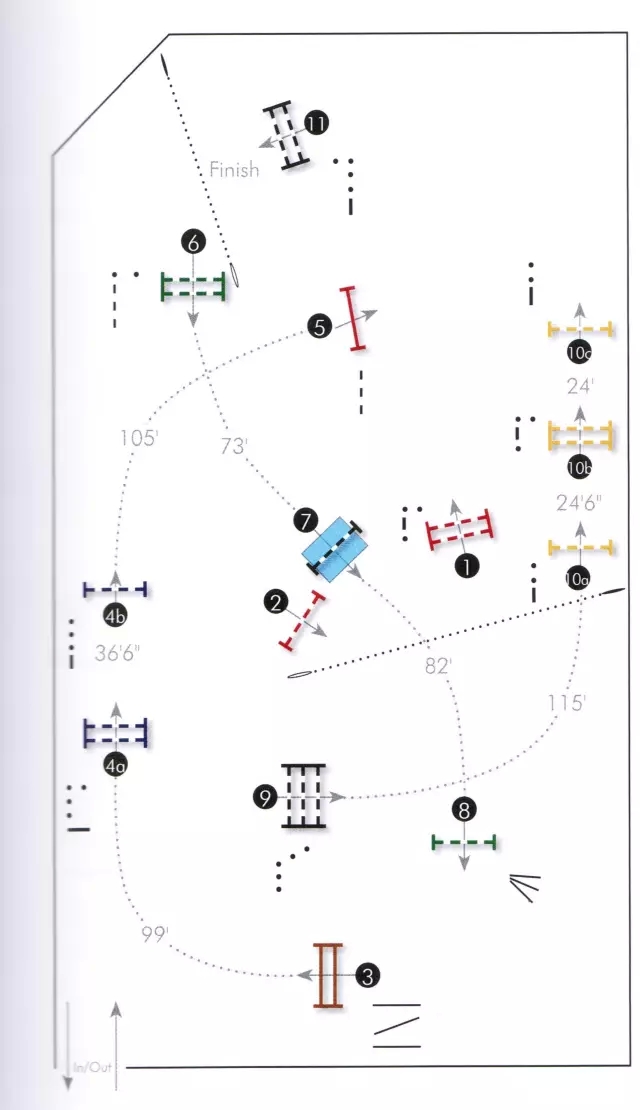 此示意图为场地路线设计师所称的“路线图”,包含了一个障碍搭建团队从头到尾需要的所有信息。每道障碍旁边的黑色圆点和破折号分别代表横杆和木板,并表明正确的摆放顺序和位置。比如,第1道障碍是一道伸展障碍,依照标记所示,前面的障碍架上应依次摆放横杆、木板和横杆,后面的障碍架上应只有一根横杆。再如第3道伸展障碍,标记表示在前面的障碍架上中间的横杆是成一定角度摆放的;而第8道垂直障碍的横杆被摆成了一个扇形。在路线图中,两道障碍之间的相对距离(包括组合障碍内部的间距)都用虚线标记了出来,虚线上的数字表示的就是间距的长度。本场比赛要求的速度为每分钟350米。路线图旁边也注明了整个赛道共440米,因此规定完成比赛的允许时间(T/A)为76秒。