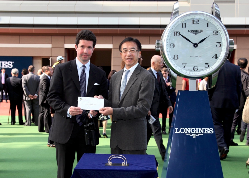 法国代表“多利得”获选2012年浪琴表香港瓶最佳外观马匹。香港旅游发展局主席田北俊(右)颁发五千元奖金予负责料理该驹的练马师杜诚高。