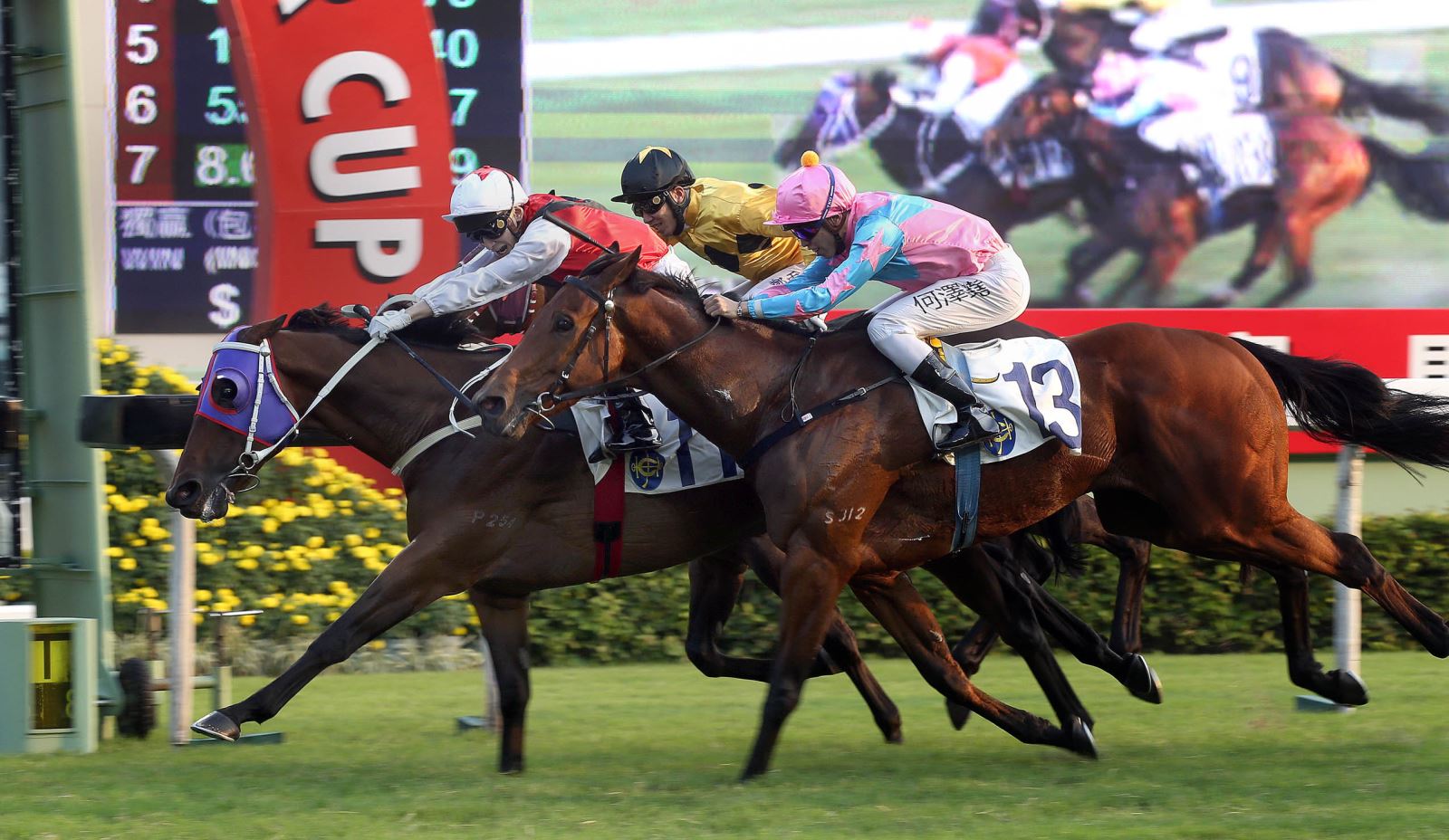 告东尼训练的“万事勇”(11号马),于吴嘉晋胯下力压“岂等闲”(13号马),胜出今日于沙田马场举