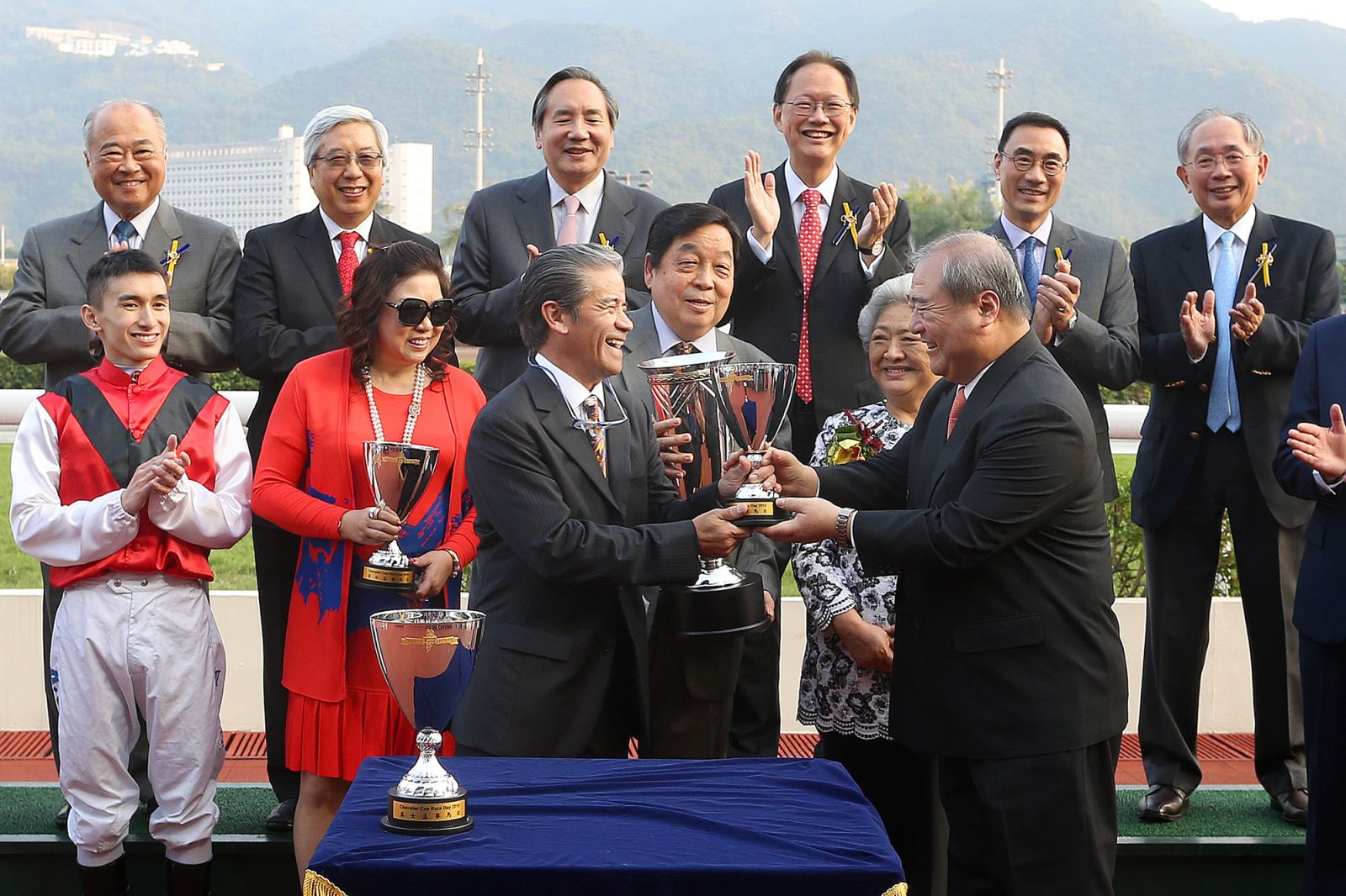 其士国际集团有限公司主席周亦卿伉俪颁发奖杯予“万事勇”的练马师告东尼。