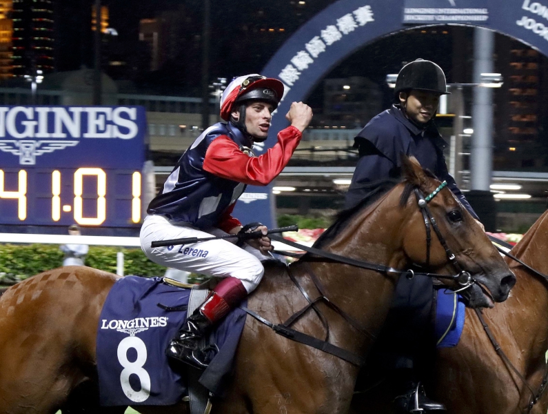 浪琴表国际骑师锦标赛尾关在第八场上演,南非代表雷景勋策骑“骏将”(8号)胜出。