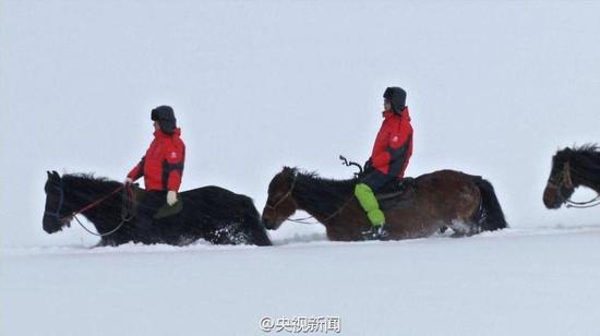 新疆阿勒泰连续降雪14天 市民骑马前行如"蛙泳"