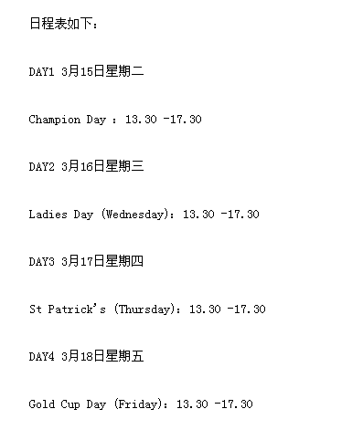 切尔滕汉姆赛马节于每年三月中旬举行,从2005年开始,切尔滕纳姆赛马节变为时长四天的节日,主要进行障碍赛和马术跨越赛,英国和爱尔兰最好的赛马和骑师将出征。其中,越障赛的奖金仅次于英国国家障碍大赛。今年的赛马节从3月15日狂欢到3月18日,民众将享受赛马节带来的兴奋。