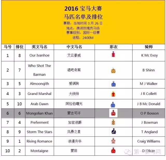 明日(3月26日),总奖金150万澳元的2016宝马大赛(The BMW,2400米,G1)将于玫瑰岗马场点燃战火。据第一赛马网获悉,赛事主办方已于近日公布了本场比赛的最后出赛马匹名单及排位。根据该排位表,即将列阵角逐本战的赛驹共10匹,其中包括了中国莱德马业旗下名驹“蒙古可汗”,它本次将排在第6闸出赛。