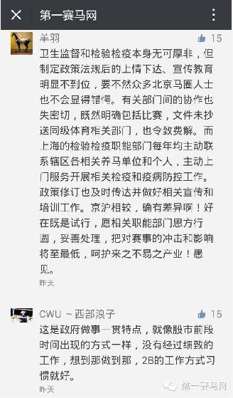 暂不说“出事”的42号是否跟46号文冲突,马友们更为担忧的是,这份42号红头文件由正处级单位“北京市动物卫生监督所”制定发布,管辖范围限于北京市,如果继续试行生效下去,影响的赛事将包括2016年上海环球马术冠军赛、2016年国际马联场地障碍世界杯中国联赛等。