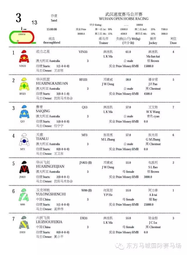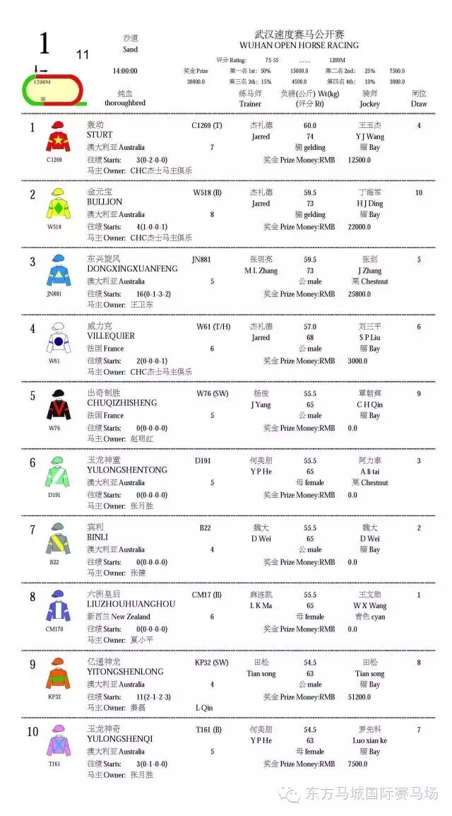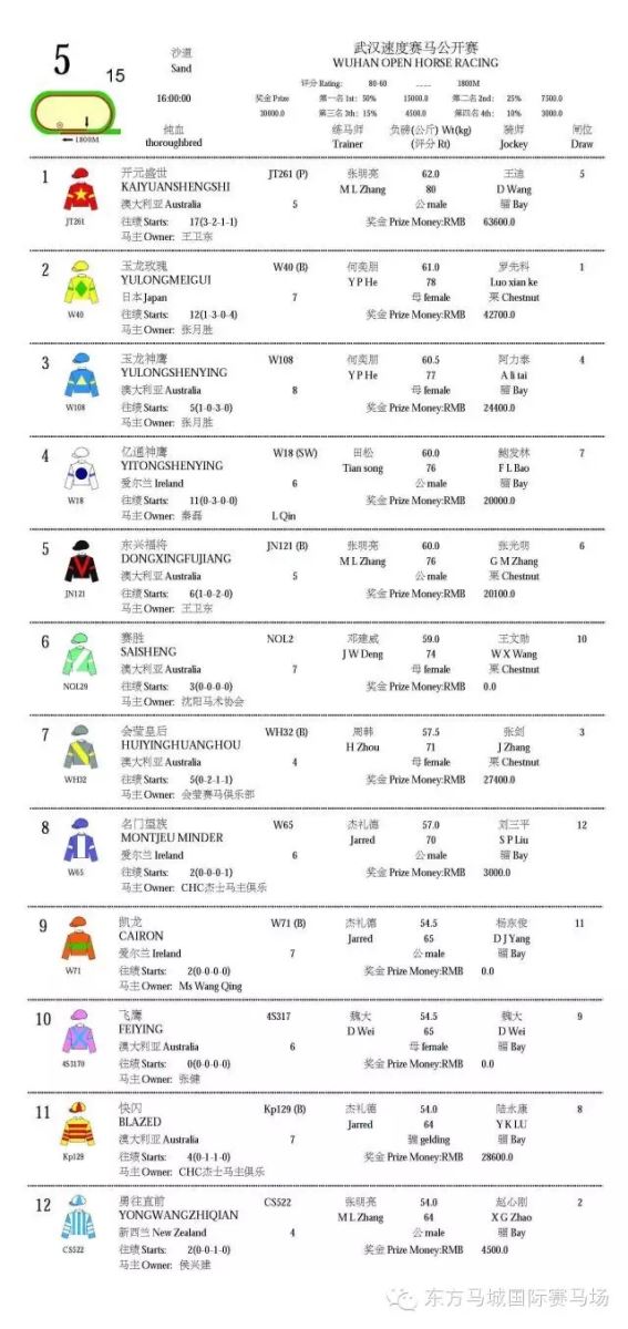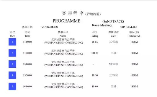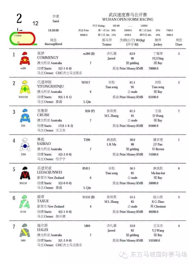 2016武汉速度赛马公开赛“赛马助跑汉马”主题赛马日将于4月9日鸣铃开闸。46匹精英赛驹各得其位,重量级佳驷已蓄势待发列阵东方马城国际赛马场。明日东方马城国际赛马场将会上演5场纯血马速度赛马赛事,其中1100米100-80二班赛事及1800米80-60三班赛事颇具看点,两场赛事均吸引多匹顶班实力赛驹参与竞逐。