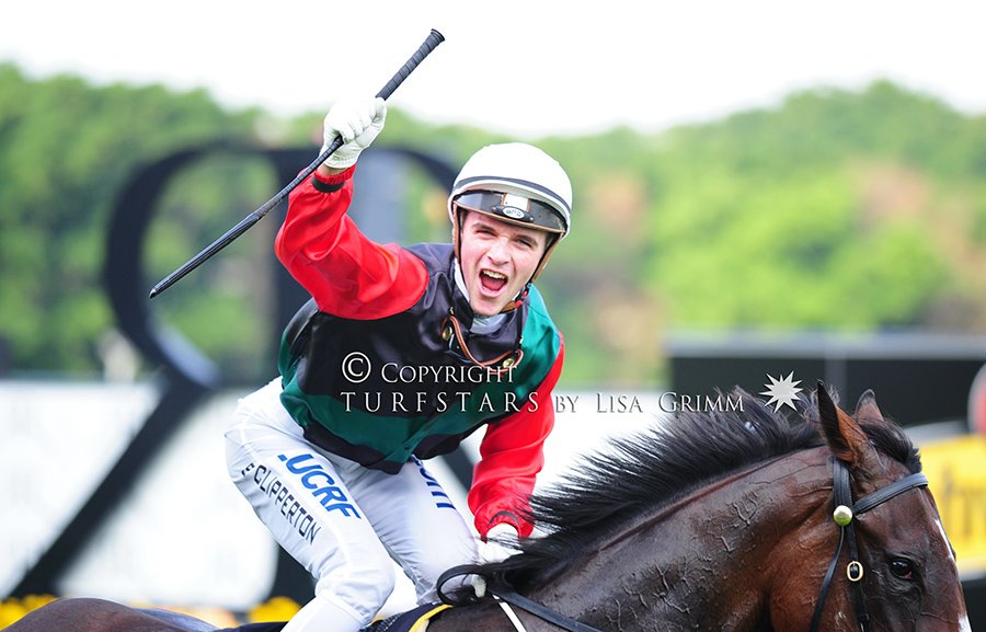 骑师Sam Clipperton赢赛后兴奋挥手,网络图片
