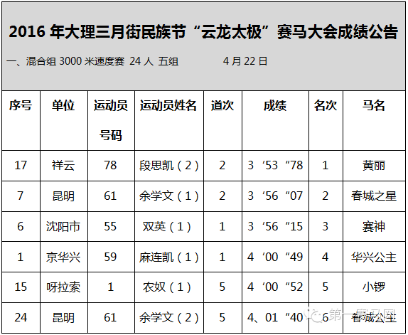第一赛马网特派云南大理采编王颖报道 今天(4月22日)中午12时整,大理“三月街”第二天赛事,五场混合组3000米途程速度赛马决赛正式开赛。但现场观众很快发现,除了第五场赛事五驹同时出闸之外,从第一场到第四场都有赛马退出比赛。根据此后赛马出赛情况统计,四场共有8匹赛马未参赛,另有数匹赛马未能跑完3000米途程。最终,17号马“黄丽”在骑手段思凯胯下夺得第一名,比赛时间为3分53秒78。