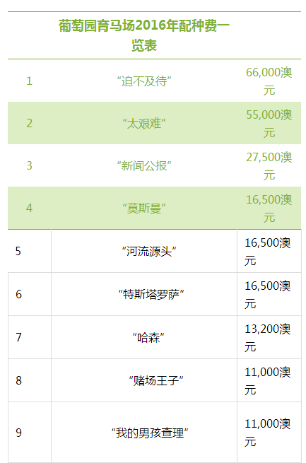据第一赛马网获悉,世界级纯血马育马商葡萄园育马场已于近日公布了2016年种马配种费,其中包括了冠军父系“迫不及待”、“太艰难”以及新晋种公马、CHC中国杰士马主俱乐部旗下“新闻公报”和“河流源头”。