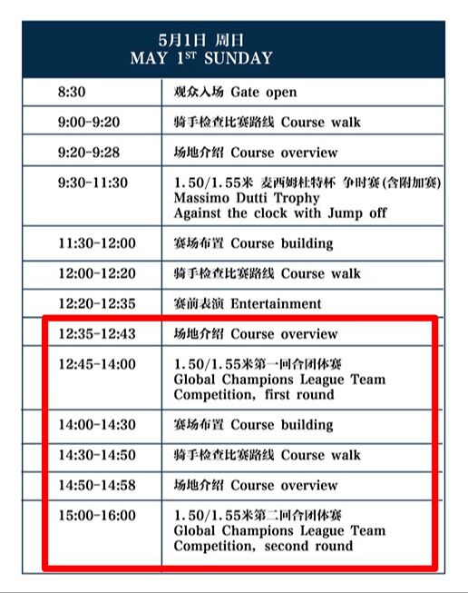 第三比赛日:5月1日上午09:20-11:30 下午12:35-16:00