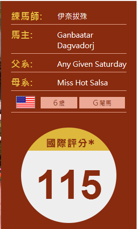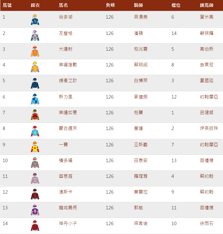 根据香港赛马会日前所公布的获选参赛马匹名单及排位,本届“主席短途奖”共有14匹马参赛。其中包括了评分高达119分的香港短途名驹“友莹格”,即将前往英国雅士谷征战“钻禧锦标赛”和“皇席锦标”两赛的香港明星“新力风”,以及澳洲最出色的短途之星、目前以121分排在世界马匹排名的短途类别中高踞榜首的“尚多湖”。值得一提的是,本届“主席短途奖”吸引到澳洲顶级短途佳驷、2016阿乔斯短途锦标盟主“缓冲之计”前来参赛。此外,美国代表“蒙古周末”实力也是不容小觑。上述实力派赛驹本战狭路相逢,令此赛成为了马迷们无限期待的世界级王者之战。