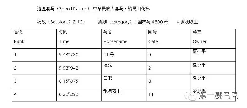 第二项赛事为中华民族大赛马·裕民山花杯(国产马)4800米,共分两个场次进行,“11号马”、“坦克”、“白顶头”以分别以5分44秒720、5分53秒942、5分57秒550位列前三,有意思的是,前两名马匹均为马主夏小平旗下爱驹。