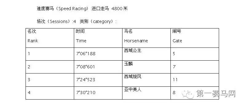 第三项赛事为进口走马比赛4800米,“西域公主”以7分06秒188获得第一;“玉麟”以7分08秒601获得第二;“西域旋风”以7分24秒523获得第三。