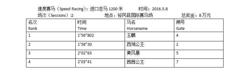 在进口走马1200米赛事中,马主阿布力孜的爱驹“玉麟”以1分56秒802折桂,马主侯天荣旗下宝马“西域公主”以1分58秒30屈居第二,马主陆成昌的爱马“黄风暴”则以2分02秒63位列第三。