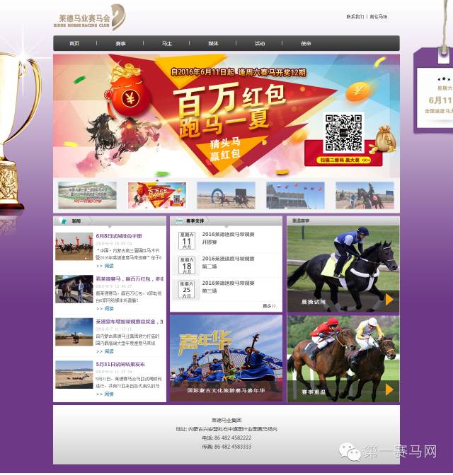 莱德赛马会官方网站共6 大页面:主页/赛马资讯/成为马主/媒体中心/活动与娱乐/赛马知多点,每个页面都有其子页面。是目前国内以赛马会命名的最具专业性的赛马网站。网友可随时登录http://www.riderhorseracing.com/ 进行浏览。