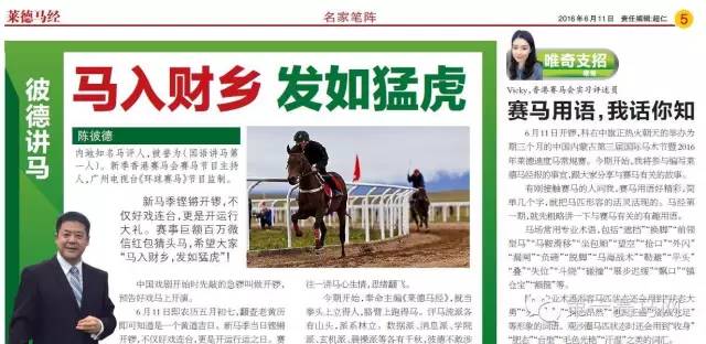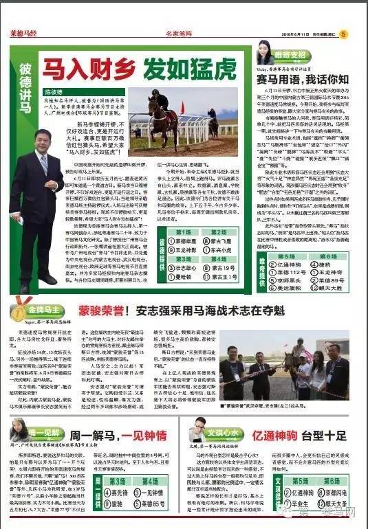 陈彼德指出,《莱德马经》还设置了“人马冠军像”栏目,中国内地的马主对推动中国马业发展居功至伟,从选马,饲养,调教,到报名、评分、班次,呕心沥血,在莱德赛场上,当他们的爱驹赢得了头马,主办方会请他们走上领奖台,《莱德马经》也拿出一定的篇幅进行报道,为他们鼓劲加油;还特别安排了“第一高见”和“金牌马主”栏目,为他们摇旗呐喊,另外,《莱德马经》分别安排了骑师和练马师的初赛分厩表以及龙虎榜,一目了然。