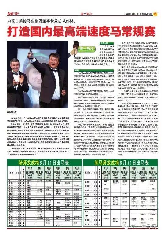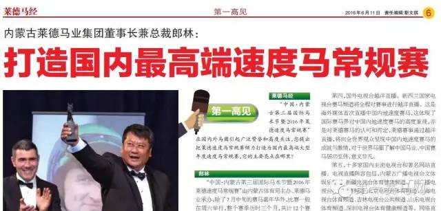 这一次,中国马业巨头、内蒙古莱德马业集团董事长郎林又站在了时代的赛马潮头。2016年6月11日,“中国·内蒙古第三届国际马术节暨2016年莱德速度马常规赛”即将在科右中旗莱德赛马场开锣,同一天,一份暌违中国内地近20年的马经也将横空出世。