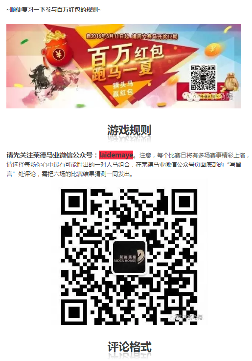 比赛结束后,莱德马业会在三天后公布并统计评论区的竞猜留言,给猜中并入选的马友发送微信红包。