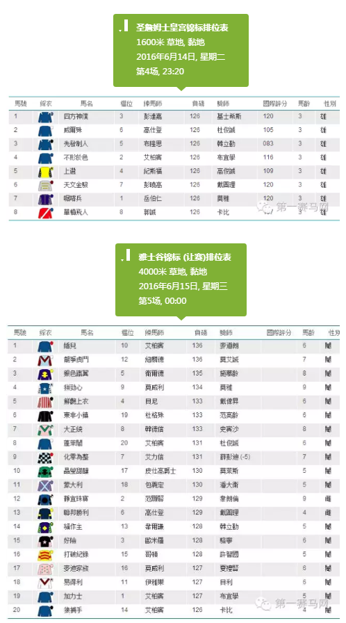 1、皇席锦标赛马日:6月14日星期二(北京时间晚上九时三十分开跑)