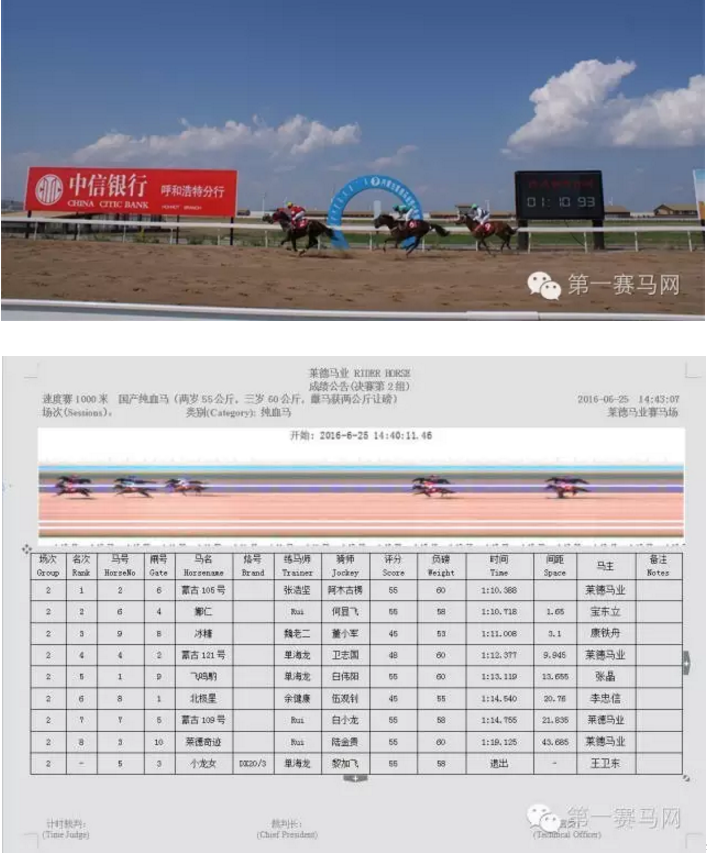 6月25日,“中国·内蒙古第三届国际马术节暨2016年莱德速度马常规赛”(以下简称莱德常规赛)第三个赛马日在内蒙古科右中旗莱德新赛马场激情开赛。当日共进行了6场赛事,第二场国产1000米纯血马比赛中,莱德马业旗下“蒙古105号”凭借半个身位的优势夺得第一。