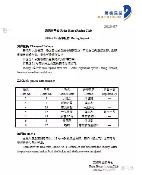 首先在本次比赛当中,骑师邓小龙在第一场比赛完成后报告腿部受伤,不能在当天继续比赛。经赛事董事察看伤势,批准更换骑师如下: