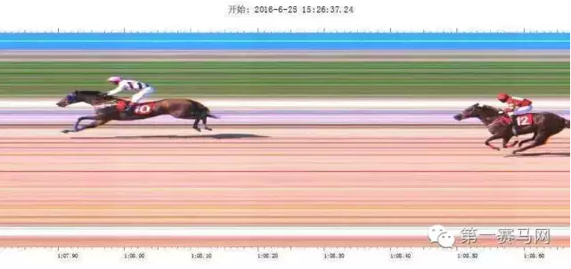 10号马“金色世界”一开始紧随1号马“宝湖精英”,在中段更是齐头并进,但在最后冲刺阶段,由于负磅较轻,“金色世界”快速发力,超过“宝湖精英”,轻松拿下头马。