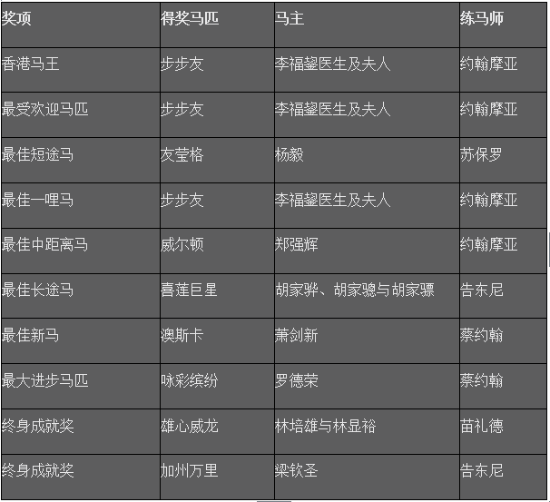 迄该唯一曾两夺香港杯(一级赛)的佳驷“加州万里”,以及两届香港马王“雄心威龙”,相继于季内光荣退役。为表彰“加州万里”及“雄心威龙”对香港赛马的杰出贡献,它们均于当晚的典礼上获颁发终身成就奖。