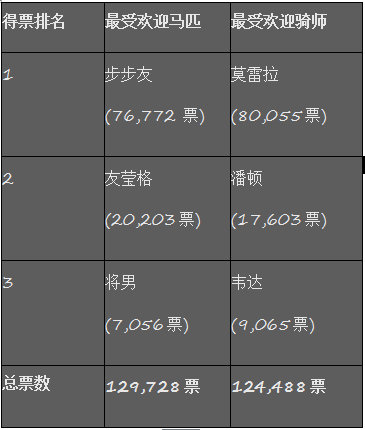 “最受欢迎马匹”及“最受欢迎骑师”均由公众投票直接产生。投票于2015年6月9日至6月24日举行。两项选举中前三名得票情况如下: