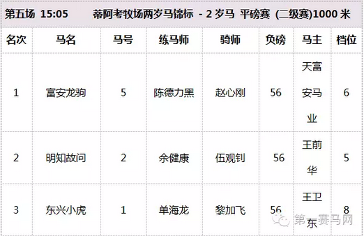 第五场比赛前出现了临时退赛和入闸时间过长被强行退赛的情况,本场最终只有11匹赛马参赛。比赛出闸抢放十分顺利,天富安马业的“富安龙驹”一路领先,而且越战越勇。在进入弯道的时候“明知故问”曾接近“富安龙驹”想要超越,但“富安龙驹”一步也没有浪费,从头到尾一路领先,最终毫无悬念地夺得冠军。夺得第二名的是马主王前华的“明知故问”,第三名的是马主王卫东的“东兴小虎”。