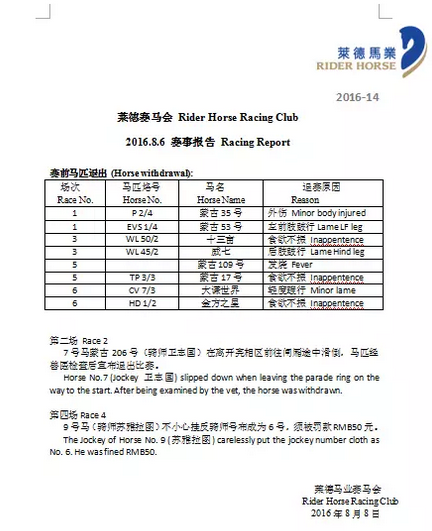 在比赛时,粗心大意也会受罚的,比如第四场的9号马(骑师苏雅拉图)不小心挂反骑师号布成为6号,须被罚款RMB50元。所以骑师在检查装备时也一定要细心点!