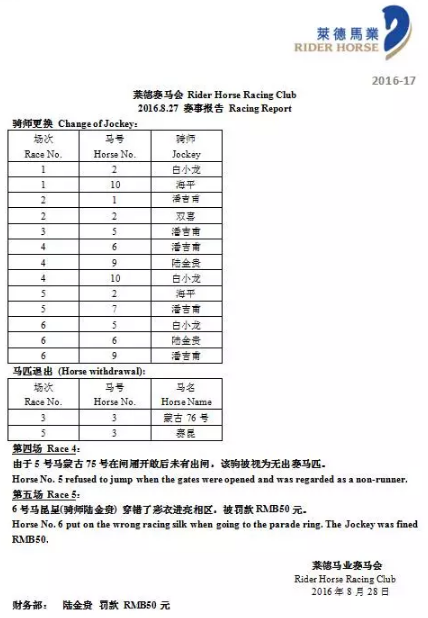 在第四场比赛中5号马“蒙古75号”在闸厢开放后未有出闸,该驹被视为无出赛马匹。而在第五场赛事中6号马“昆星”(骑师陆金贵) 穿错了彩衣进亮相区,被罚款RMB50元。所以在这里提醒各位不管做什么事一定要细心细心在细心才行。