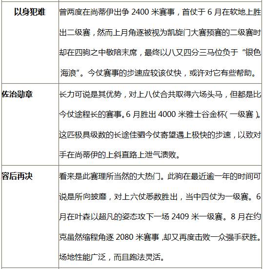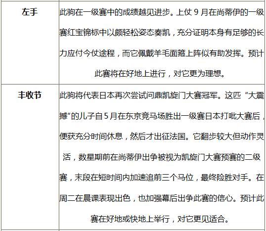 今年的凯旋门大赛由以往的隆尚马场移师至尚蒂伊上演。两个马场相比,尚蒂伊的场地变干的速度快得多,加上预测赛前下雨的机会不大,所以周日的赛事预料会在好地甚至是快地上进行。这两个马场另一主要分别是,根据以往数据,在尚蒂伊角逐2400米赛事时,排外档出闸不一定不利争胜。纪仁安本周曾表示,他认为排外档出闸或许较为有利。