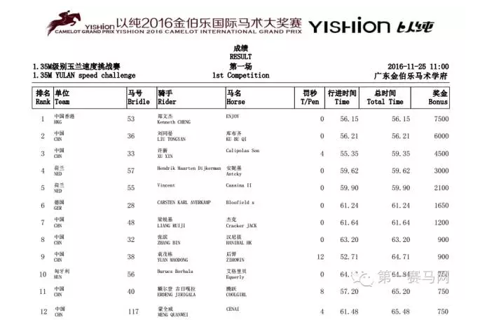 第二场为“1.35米级别玉兰速度挑战赛”,在这场赛事上强者云集,但由于速度挑战赛根据耗时多寡论英雄,因此也给很多骑手带来了很大压力。一些选手为了达到快速完赛的目的,没有合理规划赛马步幅,多名骑手出现碰落栏杆的情况,截止上半场14名骑手完赛后,前两名被来自荷兰、德国的两名选手稳稳霸占,给现场的中国骑手带来了很大压力。休赛五分钟后,下半场正式开始,第四个出赛,此次代表北京出赛的香港选手郑文杰与参赛马匹“enjoy”发挥出色,以零罚分、56.15秒的成绩力压上半场所有选手,稳居第一。随后,分别于第24位和第27位上场的刘同彦和许新凭借出色的发挥,分别以56.21和59.35的成绩夺得二三名。