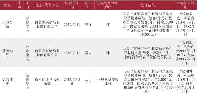 中国马术协会2016年底公布了2015年涉兴奋剂马匹、骑师及练马师的处罚决定。所公布的处罚结果名单中,内蒙古莱德马业旗下赛驹“乐道君威”及“莱德22号”双双“荣登”榜单,衡水亿通马术俱乐部“亿通神驹”也赫然在列。值得深思的是,中国马协时隔一年才陆续公布处理结果,让人不仅开始关注兴奋剂的“误用”,也开始关注国内兴奋剂检查的有效透明性。