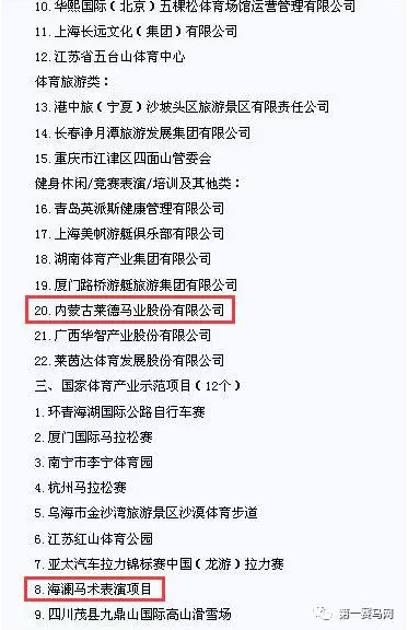 今日下午,2016年国家体育产业基地评选结果新鲜出炉。第一赛马网从国家体育总局体育经济司获悉,根据国家体育总局《国家体育产业基地管理办法(试行)》和《体育总局关于进一步加强国家体育产业基地建设工作的通知》,2016年国家体育产业基地评选结果已经确定:内蒙古莱德马业股份有限公司、海澜马术表演项目分别入选2016年国家体育示范产业单位和2016年国家体育示范产业项目。