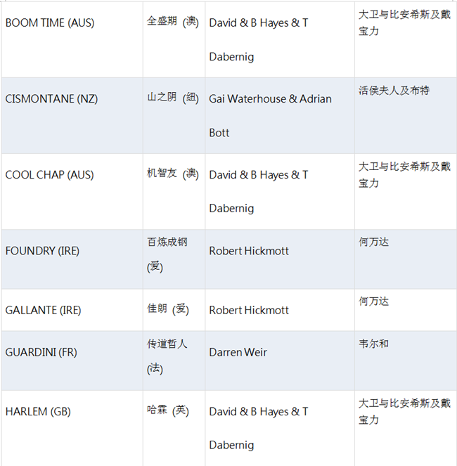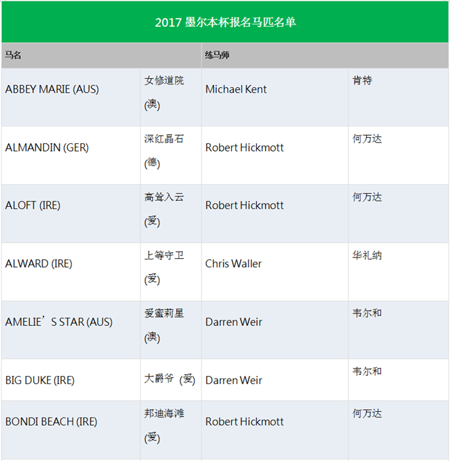 据第一赛马网获悉,维多利亚赛马会已于周一更新了有意出战墨尔本杯的马匹名单。当中除了两匹已有优先出赛权的“爱蜜莉星”(Amlie’s Star)以及“全盛期”(Boom Time)外,、“喜特来”(Hartnell)、“娇儿”(Qewy)、“根本红”(Red Cardinal)、“坚韧不拔”(Nakeeta)、“王族统治”(Tiberian)、“何必选择”(Thomas Hobson)和“深红晶石”(Almandin)等也都出现在名单内。