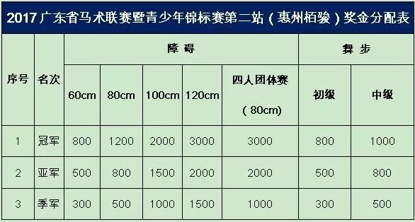据了解,2017广东省马术联赛暨青少年马术锦标赛第二站将于11月4-5日在广东惠州栢骏骑术会举行。联赛前三站总奖金均为25000元,前三名设奖金、证书。4-8名颁获证书。