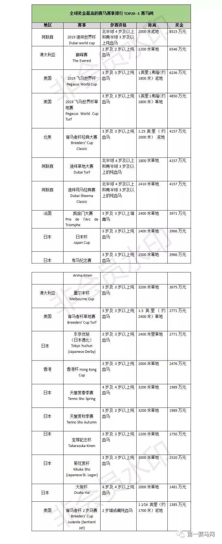 伴随着现代赛马的发展,在世界各地形成了众多享有盛誉的赛事。夺冠的荣誉感和丰厚的奖金是吸引一代代马友投身马业的主要动力。一马君今天就来盘点下世界上奖金最高的20大赛马赛事。