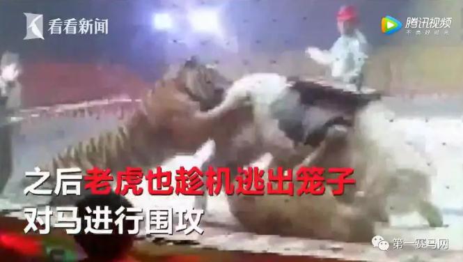 据了解,一匹神似蒙古马的马戏团用马在排练过程中突然踢了母狮一脚,引得母狮大怒,一口扑向马并咬住不放。此时,工作人员随即一齐用皮鞭驱赶狮子。正当工作人员将狮子赶回笼子时,由于狮子和老虎是在同一个笼舍,笼中的老虎趁机逃出笼子,对马进行围攻。