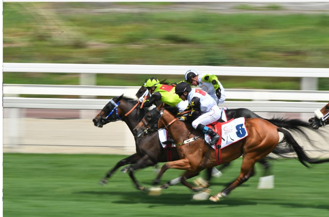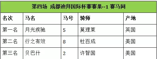 今天第四场是总奖金150万元2218米的中长途程的“成都迪拜国际杯赛”,由于两匹赛驹退赛,原有8匹赛驹参赛的赛事只有6匹马出战,也就是说只要不是垫底,就能拿到奖金。比赛开始,所有马匹冲出起点线,首先取得领先位置的是7号马“暴风带”,2号马“贝巴什”和1号马“皇家复兴”,这个顺序经过两个弯道和一个直道的角逐之后仍未有什么变化。进入最后直道,所有马匹开始加速,8号马“行之有效”首先在内栏发起冲锋,超过后力不济的“皇家复兴”和“暴风带”,并与“贝巴什”斗得难解难分。此时,5号马“月光疾驰”从外道杀出,迅速抢过所有马匹,并将优势保持到终点拿下冠军,“行之有效”和“贝巴什”则分获亚季。