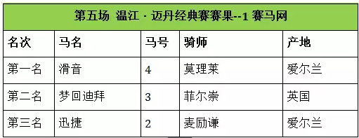 最后一场赛事1600米的“温江迈丹经典赛”,本场比赛共有8匹赛驹出战,争夺75万元的总奖金。比赛开始,位于最外道的5号马“什巴”首先取得领跑优势并迅速向内栏靠近,3号马“梦回迪拜”和4号马“滑音”则紧随其后,居于二三位。赛事无惊无险进入最后直道冲刺,所有马匹都开始加速,“什巴”因为长距离靠栏耗费太多精力无以为继,逐渐落后。“梦回迪拜”和“滑音”则就冠军谁属展开竞逐,最后“滑音”以微略优势击败“梦回迪拜”夺冠,季军被2号马“迅捷”拿下。